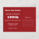 A baseball on a dark blue background decorates this unique and fun 100th Birthday "Save the Date" postcard invitation announcement. The reverse has white lettering on a red background. You can easily change the text for name, age, event, date, etc. Sports fans will love it! Matching invitation is zazzle product 161814103784013053. All Rights Reserved © 2014 Alan & Marcia Socolik.