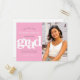 Make sure all your friends and relatives will be able to celebrate your daughter’s milestone graduation! Send out this stunning, simple, modern, personalised photo “Save the Date” postcard for an event to remember. Bold, graphic, white typography overlays a soft pink background. On the right hand side, add a photo of your choice. Personalise the custom text with your graduate’s name, class year and date. Your custom message, a soft pink graduation cap icon and your return address adorn the back. Matching invites, thank you cards, cap toppers, napkins, plates and other graduation goodies are also available in this trendy and stylish collection. Guaranteed to add stylish fun to her special occasion!