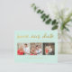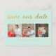 Gorgeous faux gold foil typography on the front of this designer postcard which you can upload into with 3 of your own engagement/wedding photo portraits. Easily and quickly personalise this designer professionally printed save the date postcard here and now by just typing over the example text and adding your own photographs. Elegant, chic, simple and classy gold script/cursive typography.