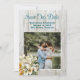 Save the date photo announcements with wood background and calla lilies bouquet design. White wood panels are the background for blue-green text. A big bouquet of white calla lilies decorates the bottom corner of the photo template. This design is also available as an instant download.