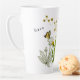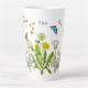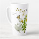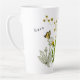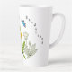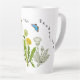 Tall latte mug for the nature lover. Dandelion plants with yellow and blue butterflies is the design that wraps around a white mug. "Save the dandelions" is the printed text that goes over the top and down the side of the design. Give to someone who believes this "weed" is a useful food for spring insects.