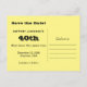 A happy yellow dog (Japanese Spitz) on a black background decorates this unique and fun 40th Birthday "Save the Date" postcard. The reverse has black lettering on a yellow background. You can easily change the text for name, age, event, date, etc. Dog lovers will adore it! Original photograph/artwork by Marcia Socolik. All Rights Reserved © 2015 Alan & Marcia Socolik.