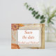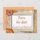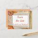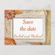 A great design for an Autumn wedding, this save the date postcard features a rustic wood image design. With orange and burgundy flowers, aged wood images, and images of white lace, "Save the date" is written in a orange font, with the couple's name written underneath. Customise yours today.
