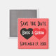 This Save the Date refrigerator magnet features black and red hearts overlaid by the template text "bride and groom." The template text "save the date" appears above the hearts, and template text for the date appears below. Design can be customised for an engagement party, bridal shower, rehearsal dinner, wedding, anniversary or valentine's party save-the-date or party favour.