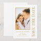 Save The Date Black Gold Stylish Script Modern Wedding Cards features a white background with your custom photo. Personalise with your text by editing the text in the text boxes provided. Designed for you by ©Evco Studio www.zazzle.com/store/evcostudio