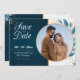 A handsome save-the-date announcement with a round photo window trimmed with blue leaves. (<a href="https://www.freepik.com/free-photos-vectors/people">People photo created by senivpetro - www.freepik.com</a>). (<a href="https://www.freepik.com/free-photos-vectors/wedding">Wedding vector created by pikisuperstar - www.freepik.com</a>). <br/><br/>The card is easy to customise with your wording, font, font colour and choice of paper types.<br/><br/>Not exactly what you're looking for? All our products can be custom designed to meet your needs at no extra charge.<br/><br/>Simply contact us at heartfelthelper@gmail.com<br/><br/>Coordinating products available: