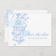 Pretty blue love bird couple drawing featuring an open bird cage hanging from a blossoming spring tree with hearts. Fashionable modern chic wedding design part of the blue bird cage romantic wedding stationary set. Edit this blue and white, save the date wedding postcard with your names, dates and own wording. © Original drawing and design by Sarah Trett.
