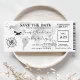 Boarding pass wedding save the date ticket invitation featuring a elegant silver foil destination world map, compass, aeroplane, and a personalised text template.