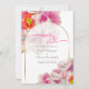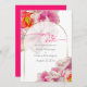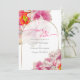 Send out your Save the Date requests- Modern text and calligraphy fits nicely inside this beautiful sheer white gold edged arch frame that shows the underlying fantasy bright fuchsia scarlet peony flowers also edged in gold - original artwork © by WhimsicalArtwork™.
