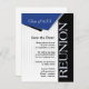 There's no mistaking it - this is a class reunion save the date card. The sophisticated design in blue, black, silver, and white is a classy way to announce the upcoming event. Subtle grey stripes in the background add interest and depth to the design.