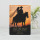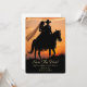 Save the Date! Country western style! A bride and groom ride off into the sunset horseback.
