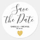 Very hip and modern typography design. Save the Date is written in a large trendy font. The wedding couple names is written in a simple font along with the wedding date. A picture gold foil heart is placed at the bottom. All text is easily customised.