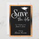 Using two distinctive fonts, I've created graphics for your announcement. The header reads "Save the date" and above it is a graphic depicting a graduation cap. All text was placed over a bordered black rectangle which overlays a bright orange background. Coordinating white confetti over this furthest brightly-coloured background, along with a black gradient image that creates an ombre result completes the border effect. Change the background colour to anything you like! The graduation cap also appears on the back. // 130, 131 //