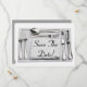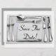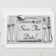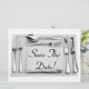 Elegant professional photograph of a formal place setting for any meal with silverware and matching grey napkin with "Save The Date!" in black (or easily change the text) on the front makes a unique invitation. Personalise the back with your information. Easily change text, text font style, and text and border colour. See matching postage stamps in MVDesigns store. Perfect for any engagement, wedding, anniversary, birthday, reunion, company events, breakfast, brunch, lunch or dinner party, and any special occasion parties.
