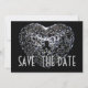 An intricately created jewellry heart bauble pendant, with shiny silver metallic finish reflecting the light against a deep and dark background. Save the Date is written in large letters on the front, with multiple customizeable text fields on the reverse side for your special information.