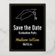 ''Save the Date' for a graduation party with this black, white, and gold postcard. You can personalise this black postcard with the graduate's name in gold script. A line of display text for the party date is at the bottom. A graduate's cap is at the top above the text on a black background.