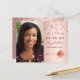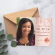On front: Add your own vertical size photo of the graduate. A rose gold, blush background colour, decorated with stars. Personalise and add a name and date. The name and the text: Save the Date are written with a modern hand lettered style script.