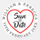 Hand script Save the Date text set within a red heart in the centre of your names and special date set in circular text.