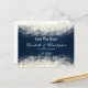 Save the date card which you can personalise / customise with the bride and grooms name and their wedding date. A fancy elegant abstract design with cream coloured lace and pearls made with circles and bubbles. The background is dark blue with faded squares off to the side. Pretty and delicate design.