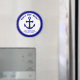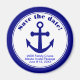 These personalised round fridge magnets have a dark or navy blue anchor in the middle. They say "Save the date" along the top edge.