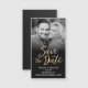 These modern, classy small save the date magnets may be cheap in cost, but they are beautiful in quality! Custom photo save the date magnets can be expensive, and save the date postcards just simply are not magnetic... With a mini magnetic business card size announcement such as this black and gold wedding template, you get the best of both worlds - affordable, and magnetic so that your guests can easily stick them to the fridge as a constant reminder to not miss your big day! This unique design features the words "Save the Date" in a faux gold glitter script font. Insert your own photo to replace the shown placeholder photo. A black and white photo works great with the black and gold background, but this colour is easily changed by selecting a different one from the picker if you chose to further customise the design. There is also a white script option to replace the gold handwriting if you wish. Category: black and gold wedding ideas; black and gold save the date magnets; and mini save the date magnets cheap. Colours: gold and black wedding theme colours.