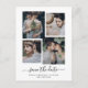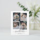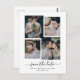 This simple yet ultra modern wedding save the date postcard features four of your favourite personal photos in a unique, layered look photo grid. The black and white card design features elegant, trendy handwritten script typography, and has a spot for your wedding information in a coordinating sans serif font.