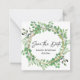 save the date modern script greenery wreath card