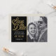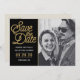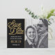 Nontraditional Save the Date Wedding postcard has a modern gold script against a black background. Your black and white photo is complimented with this bold announcement.