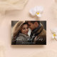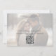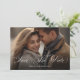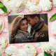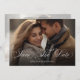 This design features a simple save-the-date card, with a modern minimalist style, for weddings, with a black and white, elegant, classy, photo template, with a QR code on the back, calligraphy script, and elegant typography