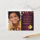 On front: Add your own vertical size photo of the graduate. A deep burgundy faux metallic looking background colour, decorated with faux gold stars. Personalise and add a name and date. Golden letters. The name and the text: Save the Date are written with a modern hand lettered style script.