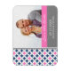 Save the date wedding magnets in elegant and modern dark navy blue, bright fuchsia hot pink, grey and white retro and casual circles and diamonds bold geometric pattern. Fully customisable with your names, photo, and wedding date, available in a wide range of matching wedding products. Contact us for a custom colour or design.