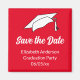 A white grad cap is above 'Save the Date" in a white script. Three lines of white display text are at the bottom. You can edit the text to show the graduate's name, a custom message, and the event date.