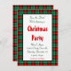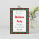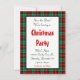 A custom Christmas party Save the Date template with script letters and a retro background pattern of red and green holiday plaid and room for your party info on the front in script and snow letters.