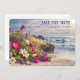Beautiful flower son a coastal setting. A white sandy beach, with the rugged shoreline and ocean. A pretty save the date card.