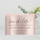 Imagine a save-the-date that’s more than an announcement; it’s a showstopper. The powdery blush backdrop, adorned with a cascade of rose gold glitter drips, isn’t just eye-catching; it’s heart-fluttering. This design doesn’t just inform; it woos, whispering tales of the enchanting day to come, wrapped in girly glam.
