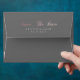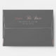 Personalised envelope with custom rose gold calligraphy script "save the date" on back flap coupled with your monograms and date in serif font on smoky grey background. On the front there is a rose gold metallic border on the bottom and inside lining in light blush. Overall elegance of this personalised envelope will surely stand out and it is a perfect match of colours