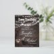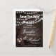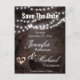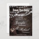 A romantic looking save the date care with a string of lights and a heart with initials in a tree.