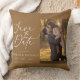 Celebrate your love story with this elegant Save the Date wedding photo pillow, featuring a romantic couple portrait and modern script typography. This custom engagement cushion is a beautiful keepsake for brides, grooms, and newly engaged couples announcing their special day.
