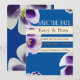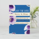 Elegant, modern blue and white Save the date invitation. Beautiful purple and white flowers with sense of summer.