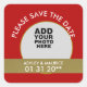 Create a nice photo wedding sticker. A circle photo template to add a special moment of the couple, with the words 'please save the date', bride and groom names and special date