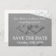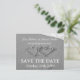 Save the date wedding postcard | Beach theme. Black and white photo image with romantic hearts on the coast. Entwined hearts drawn in the sand. Great for reminding guests of your maritime or beach wedding. Personalizable bride and groom name with elegant text.