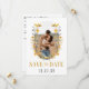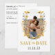 This "Save the Date" card features your photograph, surrounded by a floral wreath made up of yellow, white, and purple flowers, creating a warm and inviting feel. Below the image, the text "SAVE THE DATE" is displayed in gold, bold font, adding a touch of sophistication. The date is prominently centred at the bottom in a clean, black serif font. The overall design balances a modern and rustic aesthetic, perfect for a nature-loving couple.