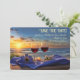 Save the Date beach style with wine! A pretty save the date card with two glasses of wine with a water view as the sunsets.