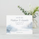 A soft, pretty winter scene in watercolor shades of blue and white, is the backdrop for this modern Wedding Save The Date Card. The reverse is a solid deep blue shade, matching the text colour. Text Front Includes: Save The Date, Bride and Groom's First Names, Are Getting Married, Wedding Date, and Formal Invitation To Follow. To personalise, simply insert your details into the template, replacing the sample text.