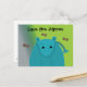 A cute big blue hippopotamus with a sweet face. A shaded blue green background with little brown and rose flowers around him. The saying Save the Hippos can be changed as desired on this postcard.