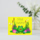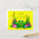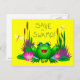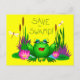 Save the Swamp postcard, Beulah the Frog (a true femme fatale of the frog world) with pink lilies, dragonflies, cattails and marsh foliage, cheerful yellow background. Wetlands are abundant with diverse wildlife and colourful flora, and are a vital source of natural resources. A portion of proceeds from every "Save the Swamp!" product sold goes towards environmental awareness and wetland conservation. Save the swamp and share the joy!