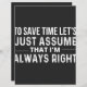 to save time lets assume im always right, to save some time, lets just assume, im always right, humor joke, sarcasm, future bank manager, retired bank manager, bank managers, i love economics, graduate, inspiration for home bank manager i m a home police officer, im an, to save time, assume, im never wrong, just assume, save time, once upon a time t