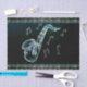 blue and black free style drawing in white of a saxophone with music notes. musical instrument in black and blues.