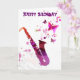 A cute design of a pink and purple saxophone with musical notes and butterflies with Happy Birthday greeting. This whimsical design is perfect for music lovers all over the world.
