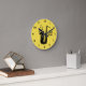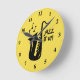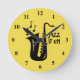 Saxophone wall clock for home, jazz club, recording studio, class room, bedroom, bar, blues cafe, pub or office. Personalizable logo and text for name or slogan. Cool Birthday gift idea for sax player, saxophonist, music school teacher, musician, friend, dad, artist etc. Instrument silhouette with musical notes. Trendy home decor and decoration ideas. Round or square shape in small or big size. Yellow or custom colour background.